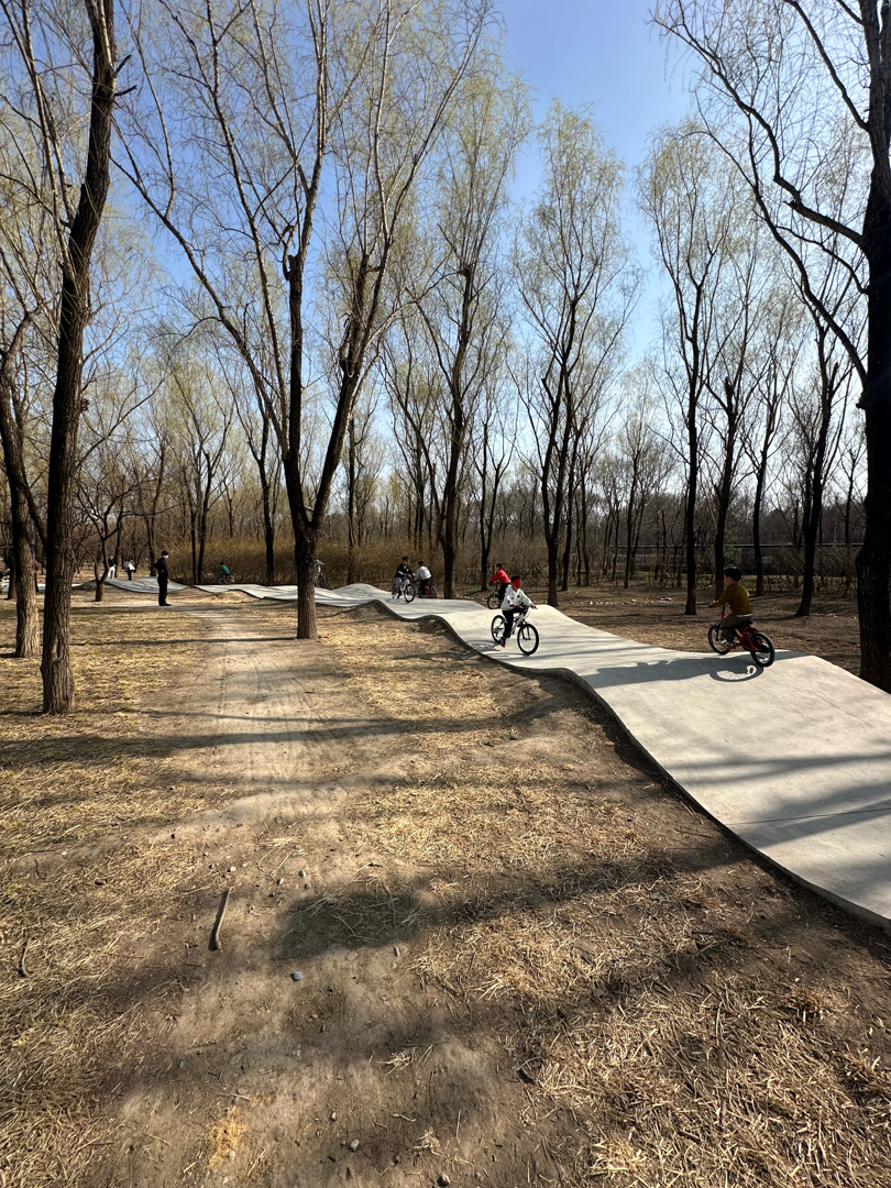 类似的安全隐患也出现在奥北森林公园的免费泵道场地。该场地不仅有波浪形坡道,还有碗池等高阶活动区域。周日下午,这里不仅有骑行的孩子,还有不少人玩滑板、轮滑。记者发现,其中的波浪形坡道未设置箭头方向指示,坡道两头都有孩子骑车上坡,就导致时常会出现冲撞的情况。滑板、轮滑与自行车、平衡车速度不一,在连续上下坡过程中,碰撞风险进一步增加,而现场规范佩戴护具的孩子也并不多。