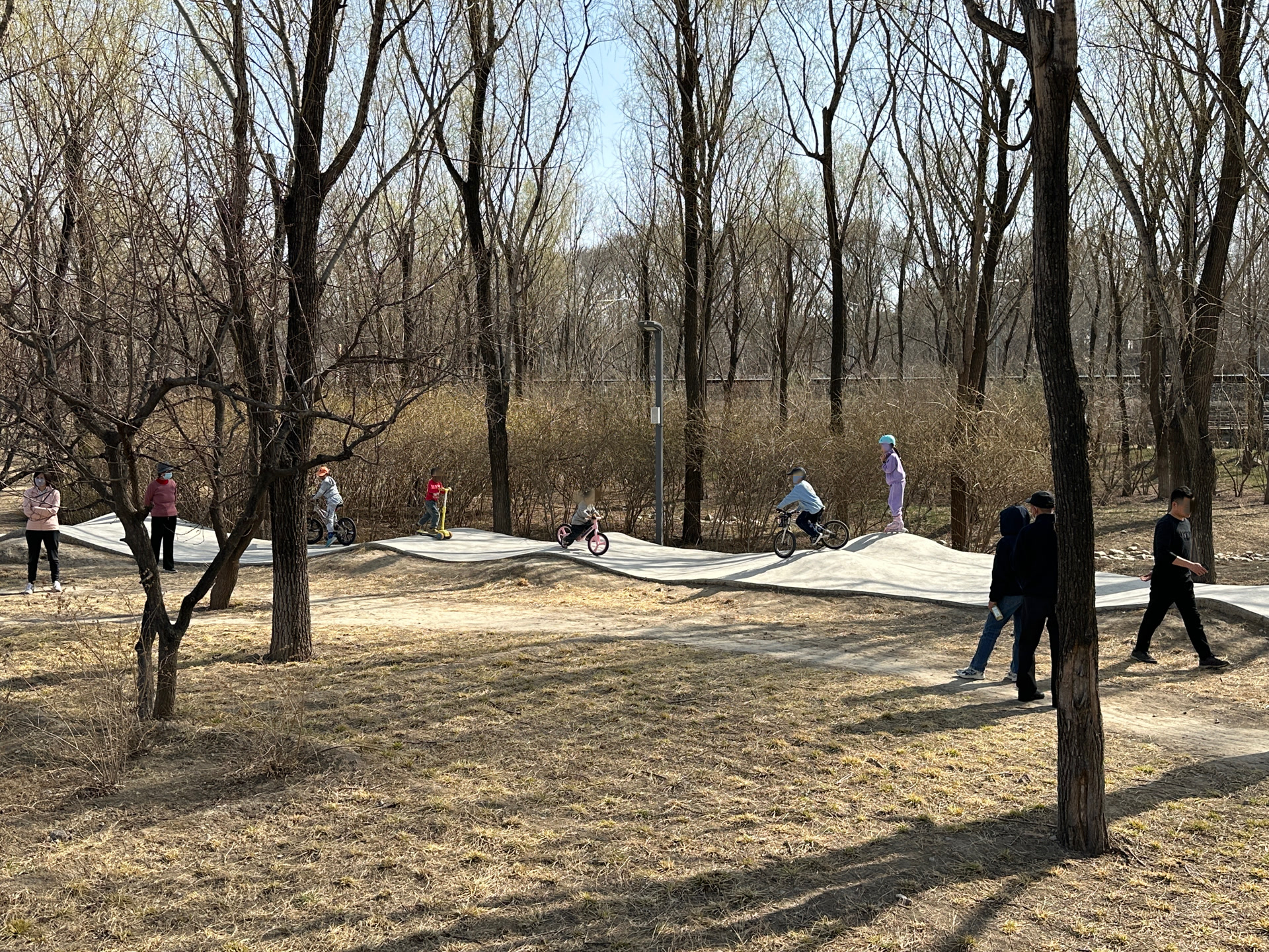 孩子自身安全意识薄弱,部分家长的疏忽大意更是加剧了安全风险。记者观察发现,一些负责任的家长会全程紧盯孩子,甚至跟随孩子骑行,不断提醒孩子“不要逆行”;但有家长则放任孩子“自由”活动,自己坐在一旁的椅子上聊天、玩手机,直到孩子摔倒后才简单提醒一句“保持间距”。更有甚者,有家长为给孩子拍照“出片”,径直走上泵道,阻碍其他孩子正常骑行。