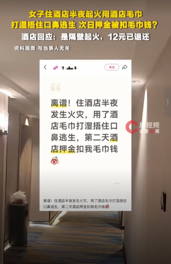 日前,一住客在湖南安化县某酒店半夜遇火灾,使用酒店毛巾打湿捂住口鼻逃生,次日押金里被扣12元毛巾钱。酒店回应称,是酒店隔壁起火,烟窜到了酒店,而客户使用的是酒店一次性套装中明码标价的毛巾浴巾。