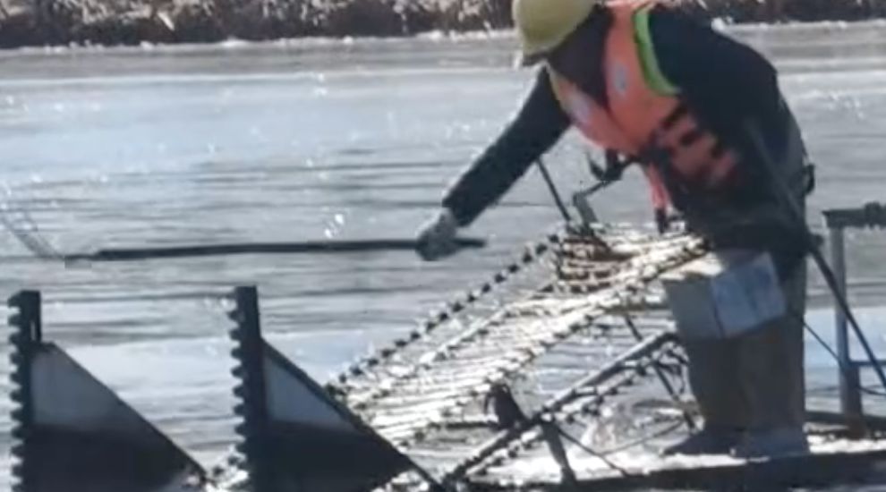 特写|两工人师傅凿冰2小时衣服湿透,只为水鸟冬天有地方“吃饭”