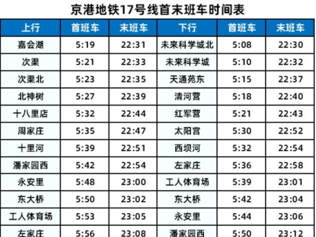 收藏!京港地铁17号线全线贯通后首末班车时间表公布