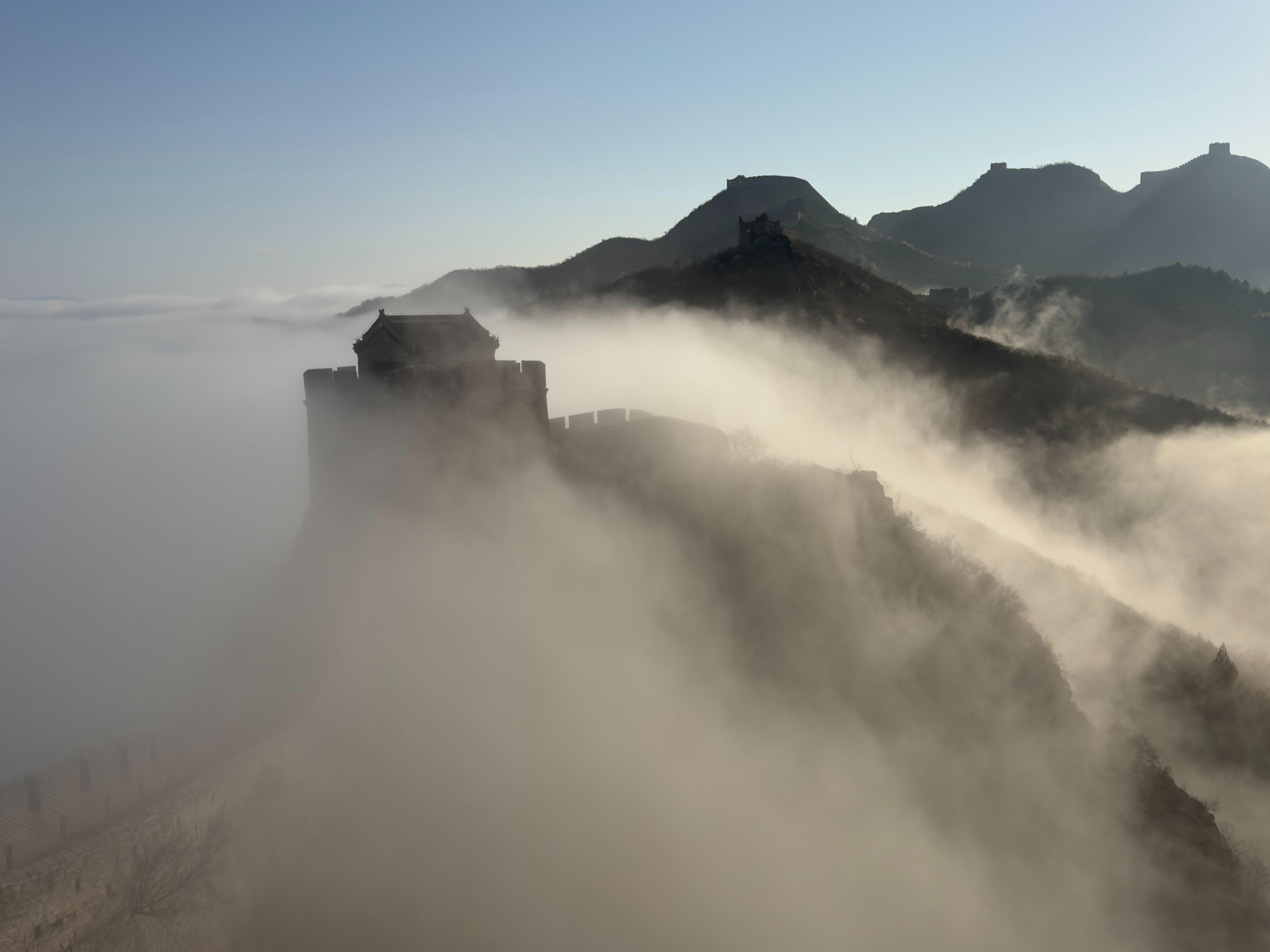 白雪与晨雾交融,金山岭长城美景如画