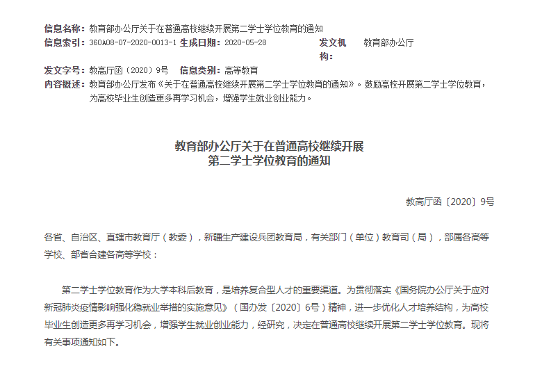 继续考研、专升本扩招之后,教育部再放大招,明确今年起在普通高校继续开展第二学士学位教育。当年毕业的应届本科生以及近三年毕业目前尚未就业的往届本科生均可报考,学制两年,毕业时按当年应届生身份派遣并办理相关就业手续。教育部鼓励有条件的高校在今年7月底完成招生,将重点支持公共卫生与预防医学、大数据、生物与医药、养老护理等领域增设第二学士学位。