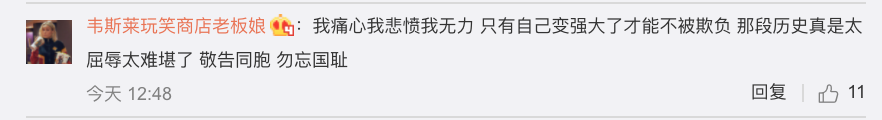 “只有自己变强大了才能不被欺负,那段历史真是太屈辱太难堪了,敬告同胞,勿忘国耻”