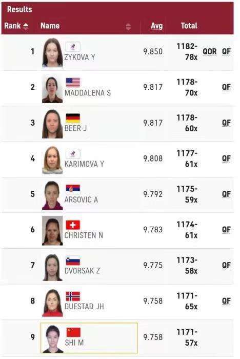 最终,史梦瑶以1171环的总成绩排名第9,和排名第19陈东琦双双无缘前8名参加的决赛。
