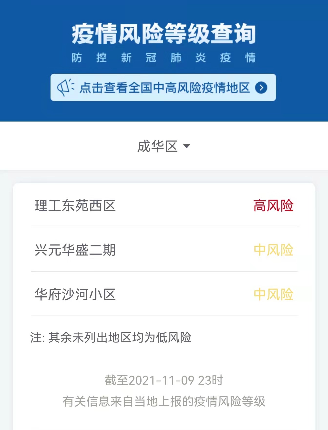 根据国务院应对新冠肺炎疫情联防联控机制关于科学划分、精准管控等要求和省市专家综合评估,经成都市成华区新冠肺炎疫情防控指挥部研究决定:自2021年11月9日起,将成都市成华区理工东苑西区风险等级由中风险地区调整为高风险地区。成都市成华区其他区域风险等级不变。