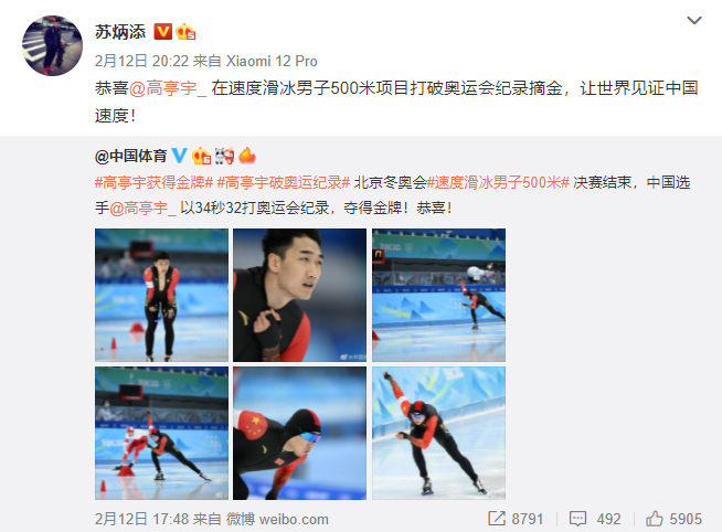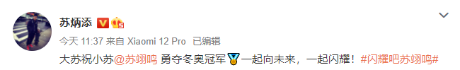 2月16日,苏炳添还发微博祝贺苏翊鸣夺得冬奥冠军。