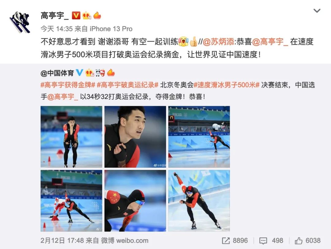 高亭宇不知道,其实苏炳添早就跟他“隔空对话”了。在他2月12日摘金当晚,苏炳添就发微博送上祝福,并称赞高亭宇“让世界见证中国速度!”