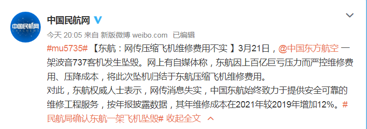 对此,东航权威人士表示,网传消息失实,中国东航始终致力于提供安全可靠的维修工程服务,按年报披露数据,其年维修成本在2021年较2019年增加12%。