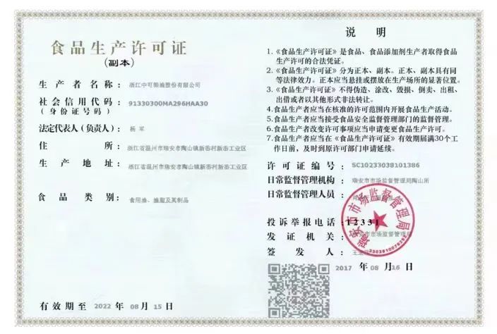 经杨浦区市场监管部门对实物和企业营业执照、食品生产许可证等相关资质的核查,主食包内“锐宝丰”鲜胚玉米油(非转基因)生产商浙江中可粮油股份有限公司具备食用油、油脂及其制品食品生产许可,注册资本1000万元。