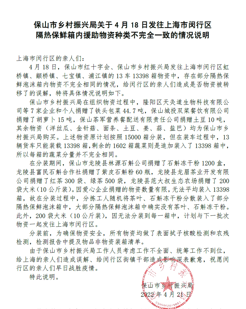 附:保山市乡村振兴局关于4月18日发往上海市闵行区隔热保鲜箱内援助物资种类不完全一致的情况说明