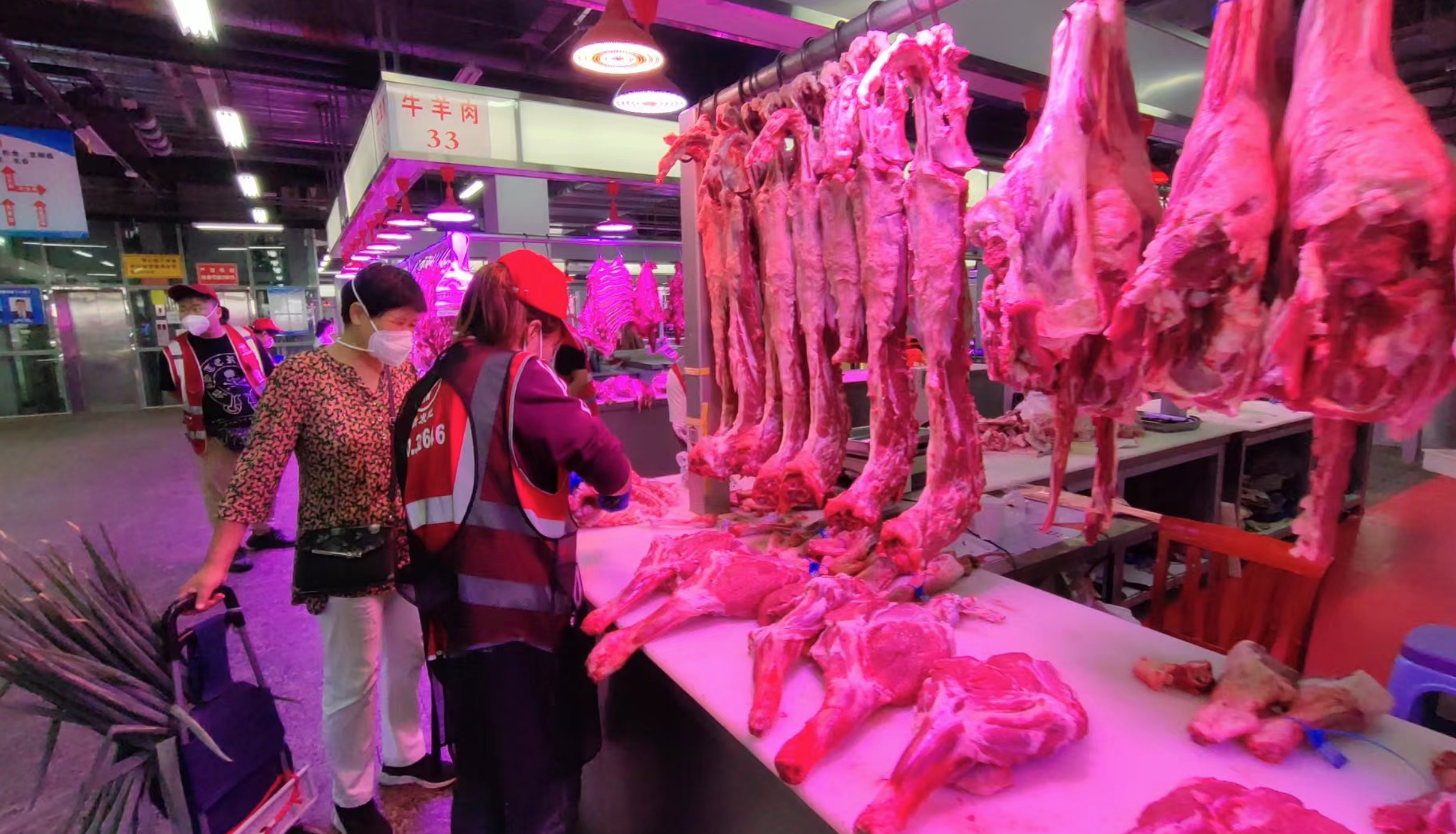 走进一层交易大厅,东南侧是牛羊肉交易区,通透整洁的摊位上摆放着牛羊肉,上方悬挂着羊蝎子、羊腿、羊排、牛排等肉品。