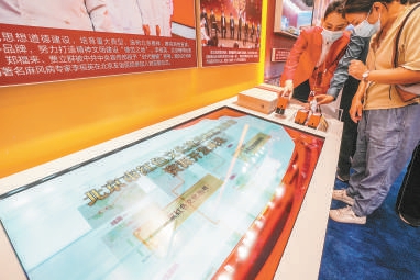 在主题成就展的北京展区,参观者互动体验北京红色文化建设成果展示。武亦彬摄
