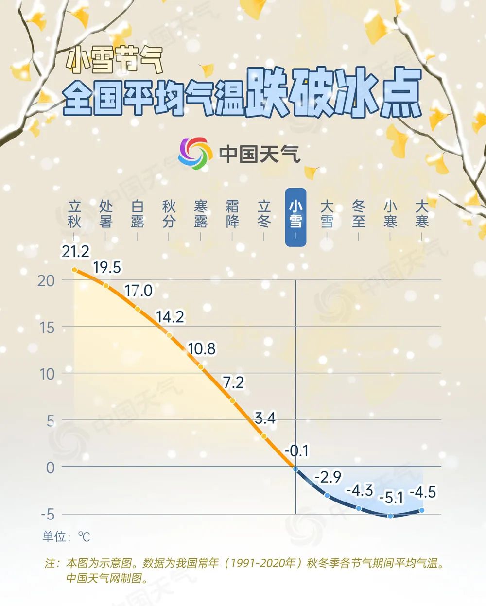 从我国常年秋冬季各节气平均气温演变图上可以看到,小雪节气,全国平均气温在下半年首次跌破冰点,从立冬的3.4℃直接降到-0.1℃,之后便是日渐寒冷,各地也将陆续进入真正寒冷的冬天。