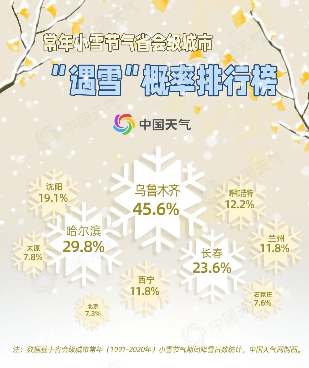 中国天气网统计了1991年至2020年省会级城市的降雪数据,小雪节气期间,乌鲁木齐平均降雪日数能达到6.8天,“遇雪”概率超过四成,哈尔滨和长春“遇雪”概率分别为29.8%和23.6%。此外,沈阳、呼和浩特、西宁、兰州这个节气的降雪概率也有一二成。