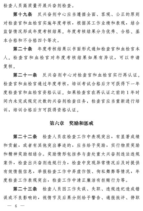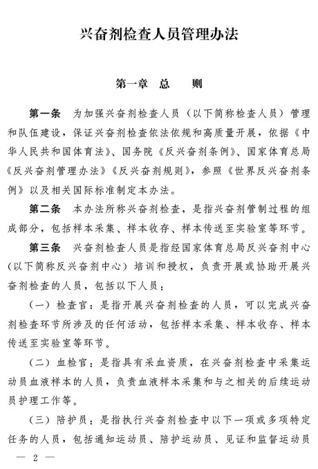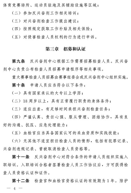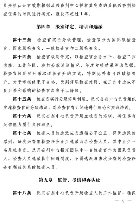 近日,国家体育总局发布了《关于印发 <兴奋剂检查人员管理办法>的通知》。《办法》提出,检查官和血检官资格认证的有效期为1年。检查官和血检官通过年度考核,培训考试合格后方可获得下一年度检查官和血检官资格认证。如果检查官在再认证之前的1年时间内未完成规定次数的兴奋剂检查任务,检查官应当重新进行培训,培训合格后方可获得资格认证。