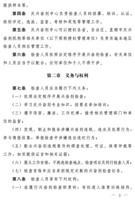 为加强兴奋剂检查人员管理和队伍建设,保证兴奋剂检查依法依规和高质量开展,依据《中华人民共和国体育法》、国务院《反兴奋剂条例》、国家体育总局《反兴奋剂管理办法》《反兴奋剂规则》,参照《世界反兴奋剂条例》以及相关国际标准,国家体育总局制定了《兴奋剂检查人员管理办法》。现将该办法印发给你们,请认真遵照执行。