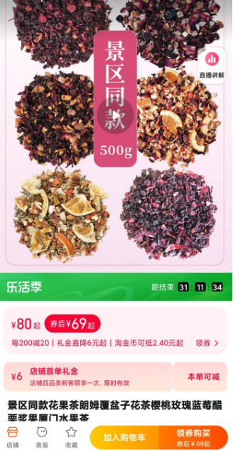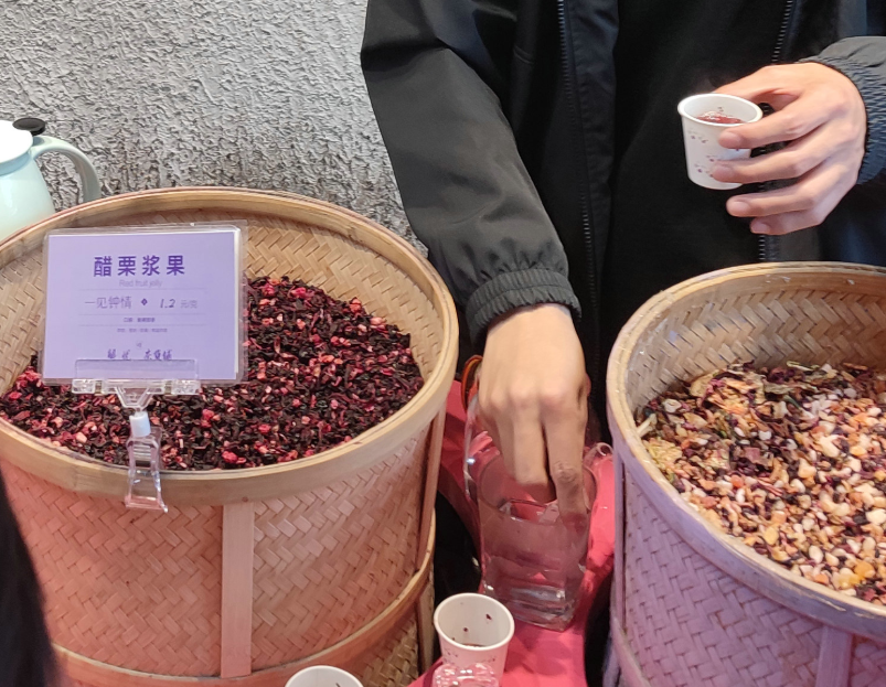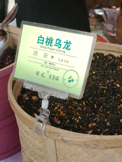 在售的花果茶大约有五六种,都盛在竹篾编制的筐内,成分多是水果干、鲜花干、茶叶等。然后根据不同的成分起了不同的名称,如蜜桃乌龙、樱桃玫瑰等。重点是商品价签上的1.2元/克。记者在店里站了一会儿,发现前来品尝和购买的游客不少。游客们多数沉浸于花果香气和味道,有的会问一句价格,有的只扫一眼价签。店员一铲子下去,然后麻利地装袋、称重。