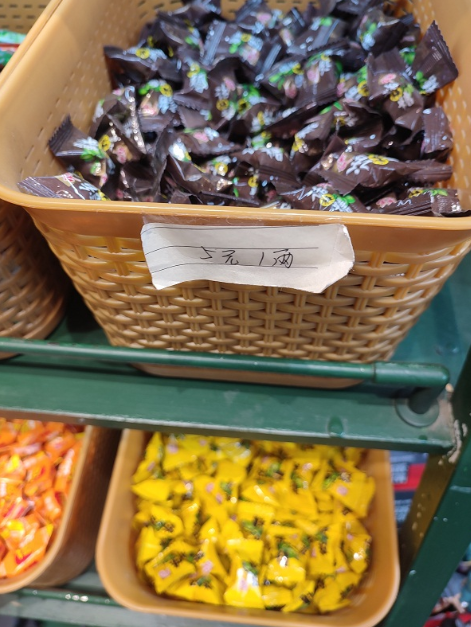 南锣鼓巷一家杂货店,销售各式各样的零食。有的零食论袋卖,有的零食论斤称,但有一种硬糖,却是论两称。这种普通的话梅糖,使用手写的价签,上面写着5元1两,稍不留神,就会误解为5元1斤。
