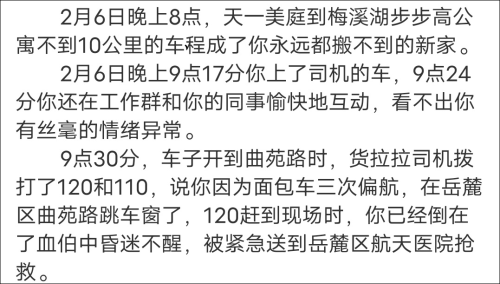 这名网友透露,事发当晚(2月6日)9时17分许,女孩上车;9点24分,她还在和同事互动,没有任何的情绪异常;9时30分,女孩因为“面包车三次偏航”跳窗,严重受伤,涉事货拉拉司机报警并拨打120。