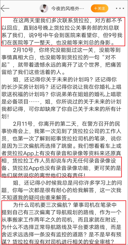 2月21日下午,网友@今夜的风格外喧嚣 发布微博,称自己的姐姐在使用货拉拉搬家服务时,在跟车途中跳窗身亡。