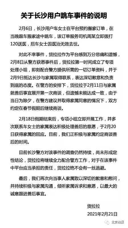 21日晚货拉拉发布事件说明称,2月6日当事司机在乘客跳车后立即联系了120急救中心将其送往医院救治。2月8日货拉拉成立了专项小组积极负责此事,9日与家属取得联系,11日与家属首次见面沟通善后事宜但未能达成一致。