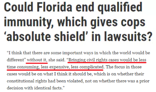 加州大学洛杉矶分校法学院教授乔安娜·施瓦茨指出,虽然很多支持“有限豁免权”的论点已经被证明完全错误或者根本无法求证,但美国的保守派政客却抱着它们不放。而如果没有这项特权,警察暴行的受害者提起民权诉讼会“更省时、更便宜、程序也更简单”。
