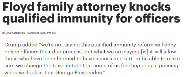 弗洛伊德家人的律师本杰明·克伦普日前受访时强调,改革“有限豁免权”并不是要剥夺警察的正当执法权,而是要给受害者诉诸法律的机会。“这个问题必须解决,因为这是在允许坏警察从事应受谴责的行为,就像我们在弗洛伊德以及数百名非洲裔被杀事件中看到的那样”。