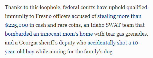 多年来,这一特权保护了无数美国警察,使得起诉警察滥用职权几乎毫无可能。正如《福布斯》杂志指出的:无论是加州弗雷斯诺警察被控盗窃22.5万美元,还是爱达荷州特警队把催泪弹射进一名无辜母亲的家中,再或是佐治亚州一名副警长在瞄准家里的狗时意外射杀了一名10岁男孩……最后都得到了“豁免”。