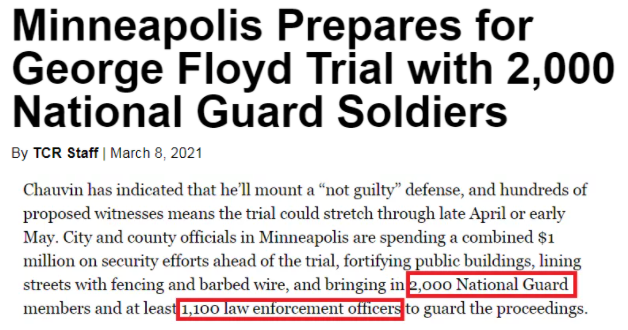 为此,如临大敌的当地各级政府总共花费了100万美元安保资金,同时派遣了2000名国民警卫队士兵和至少1100名执法人员来保护审案过程。