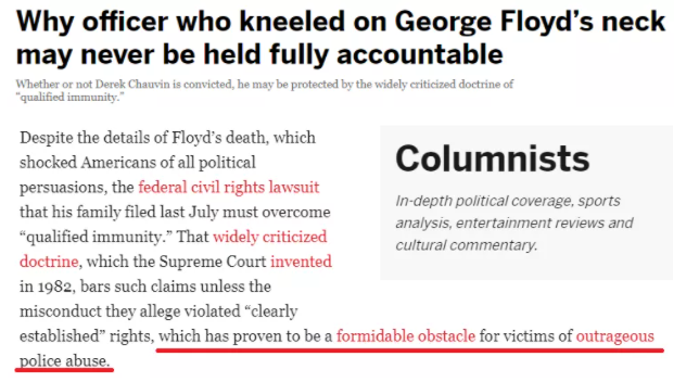 《芝加哥太阳时报》的文章称,尽管弗洛伊德之死的细节震惊了持不同政治观点的几乎所有美国人,但其家人去年7月提起的诉讼必须先过“有限豁免权”这道关。但考虑到“这一广受批评的法律原则已被证明是警察暴力受害者维权的障碍”,弗洛伊德家人在法庭上“可能不会有什么机会”。