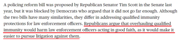 目前围绕这一法案,支持和反对意见明显以两党划界。民主党人对法案全力支持;但很多共和党议员认为,改革“有限豁免权”会使针对那些“忠实履职”的执法人员的诉讼变得更容易,从而伤害他们的执法积极性。