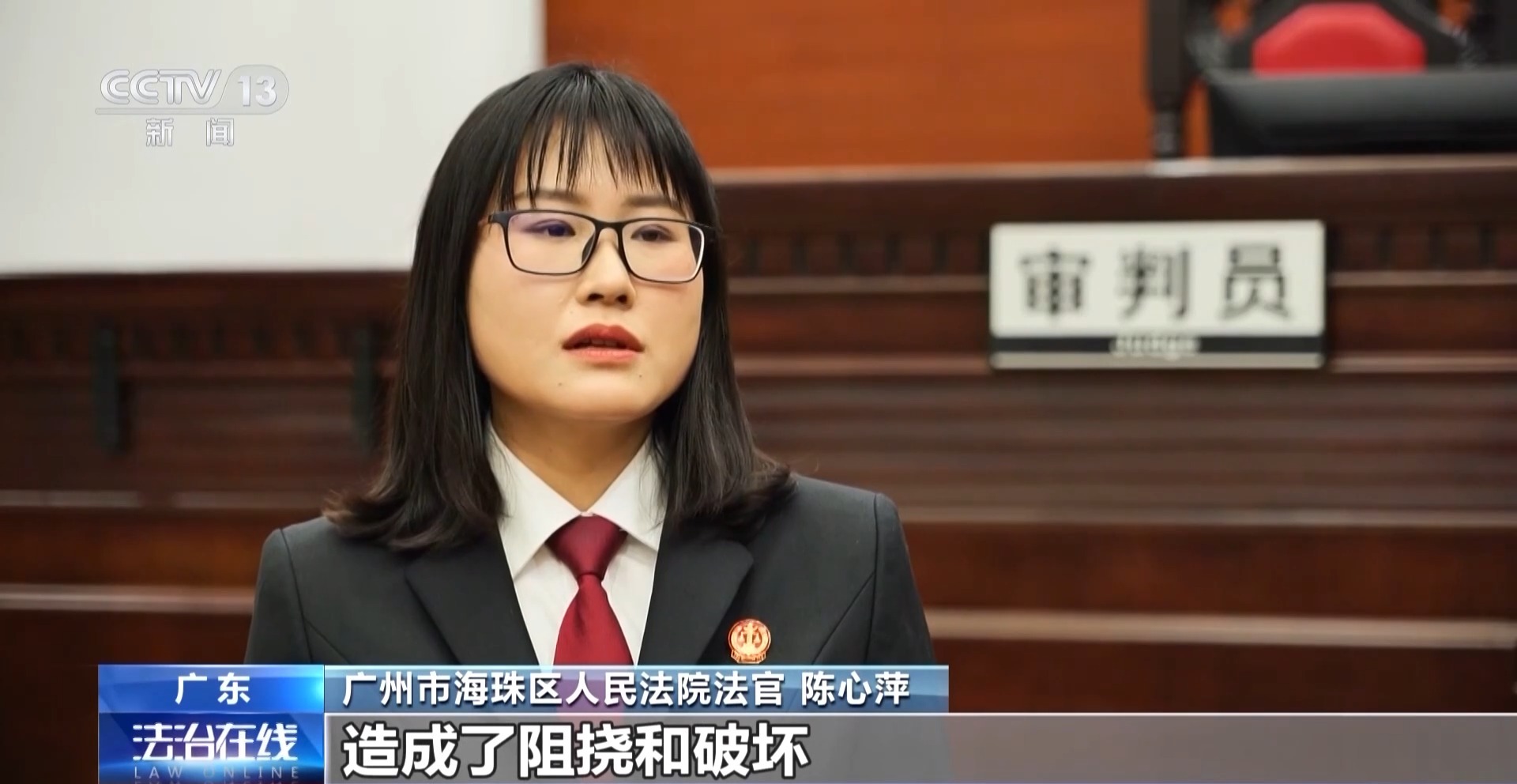 广州市海珠区人民法院法官 陈心萍:她的辩解就是认为她的行为不构成阻挠,不构成破坏,因为就是坐在自己家门口,她并没有进行一些肢体上主动去阻挠的行为。