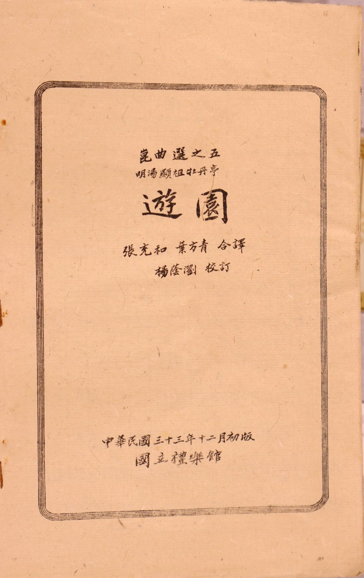 “昆曲选之六,清佚名著《铁冠图》,《刺虎》,张充和、叶方青合译。杨荫浏校订。”这是剧本封面上的文字,落款是1945年三月初版,国立礼乐馆。还有一本为《游园》(《牡丹亭》中一出戏)。