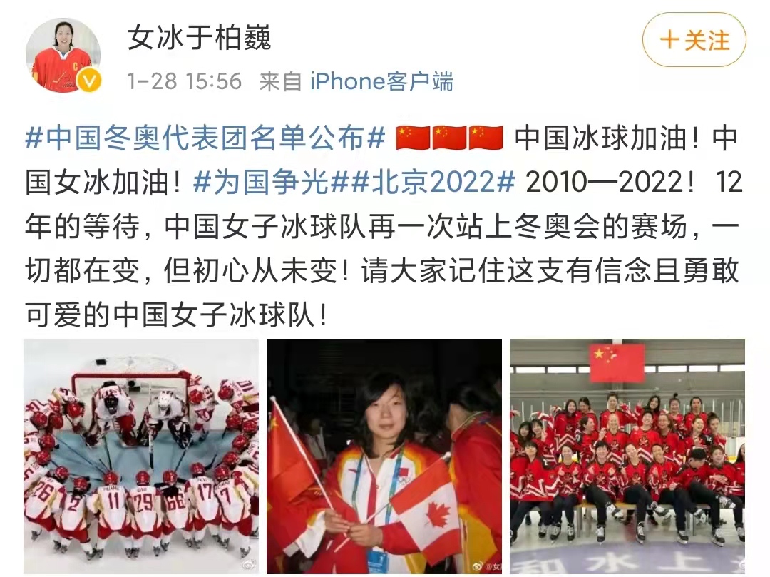 中国女冰队长于柏巍28日更新了个人社交媒体,表达了对参加北京冬奥会的期待。她写道:“2010-2022!12年的等待,中国女子冰球队再一次站上冬奥会的赛场,一切都在变,但初心从未变!请大家记住这支有信念且勇敢可爱的中国女子冰球队!”