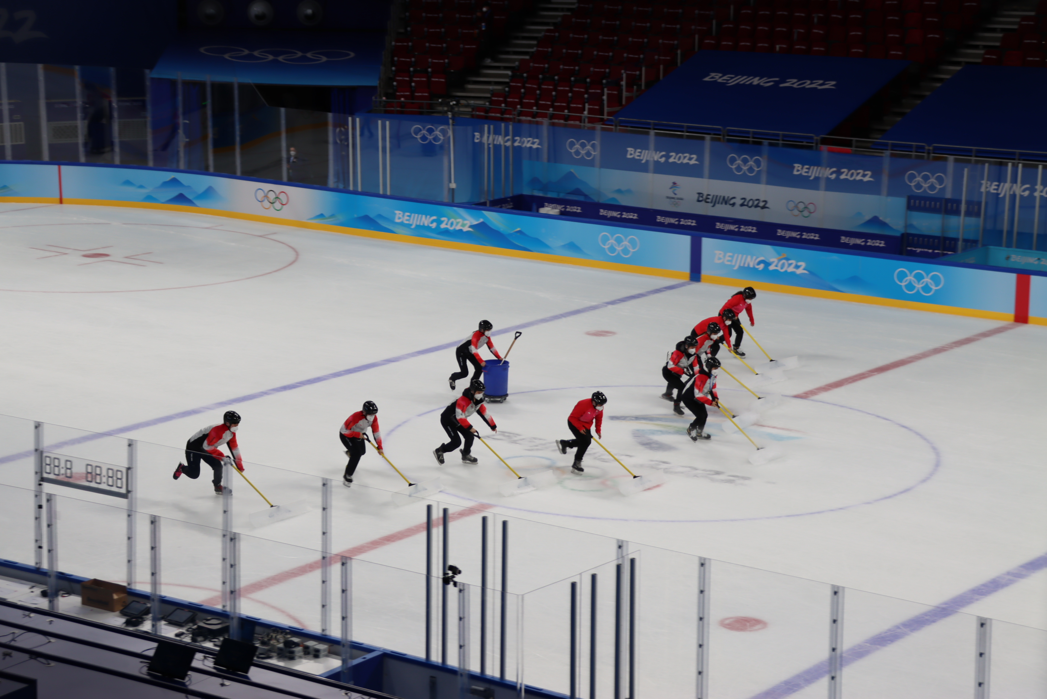在中国女冰训练结束后的这次除冰工作中,除冰团队第一时间进场,团队成员们使用铲子以大雁南飞一样的队形迅速推进,将冰碴扫至两侧,清冰人员立即用铲子将冰渣搓进桶里,随后整个团队立即离开。整个除冰过程干脆利落,不仅高效,甚至还具有一定观赏性。随后,制冰车出场进行补冰工作,让冰面以崭新的状态迎接下一支参赛队训练。