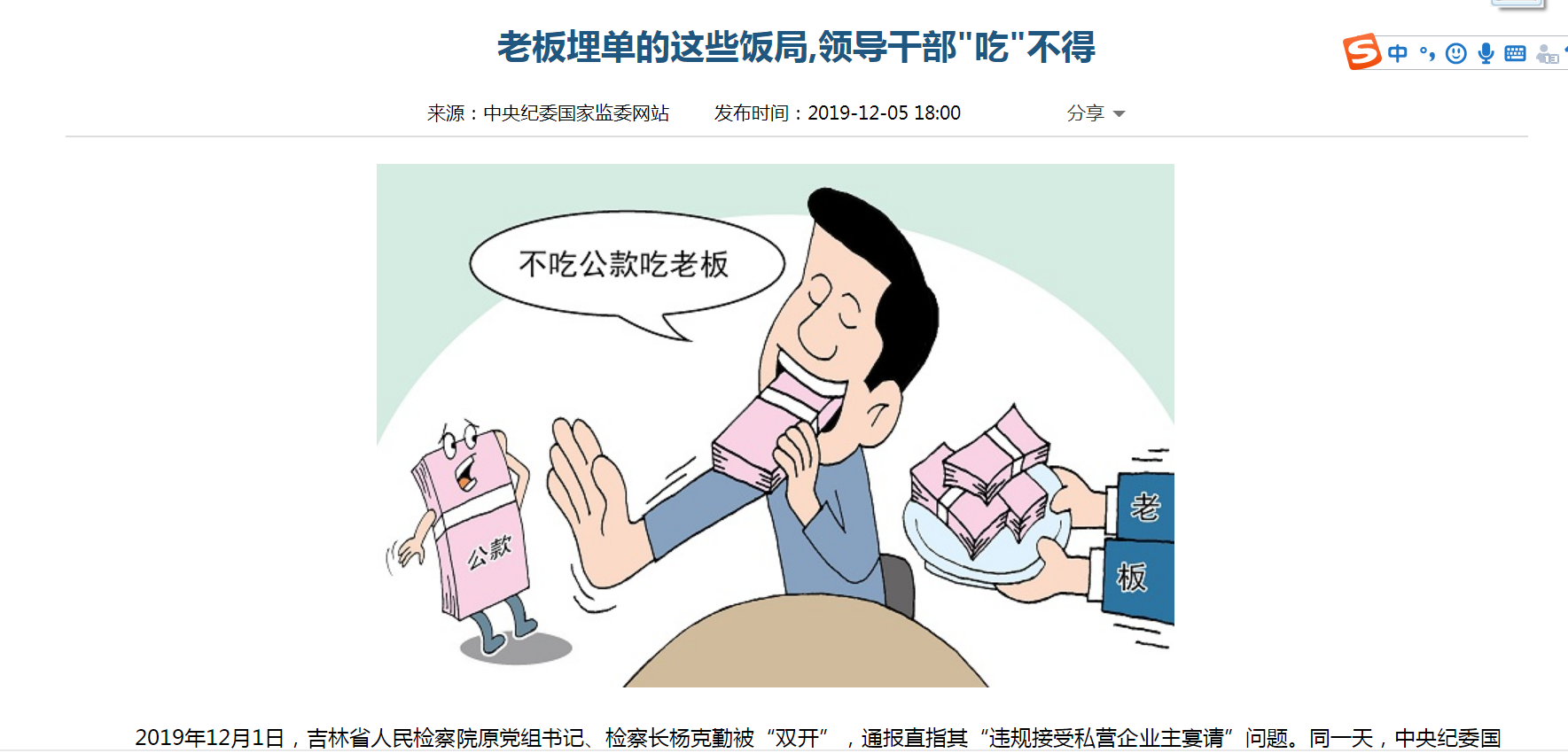 中央纪委国家监委网站以《老板埋单的这些饭局,领导干部"吃"不得》为题刊发署名文章,文中中以杨克勤为典型进行了分析。