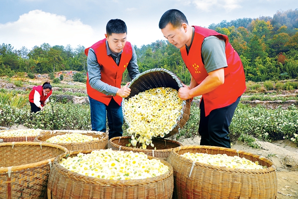 11月3日,浙江省杭州市桐庐县横村镇党员干部深入种植基地,帮助采摘、搬运杭白菊,助力菊农增收致富。(图片来源:视觉中国)
