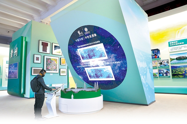 11月1日,北京展览馆“奋进新时代”主题成就展内,参观者在贵州展区“中国天眼”FAST模型前,通过耳机聆听来自宇宙深处的脉冲星声音。(图片来源:视觉中国)