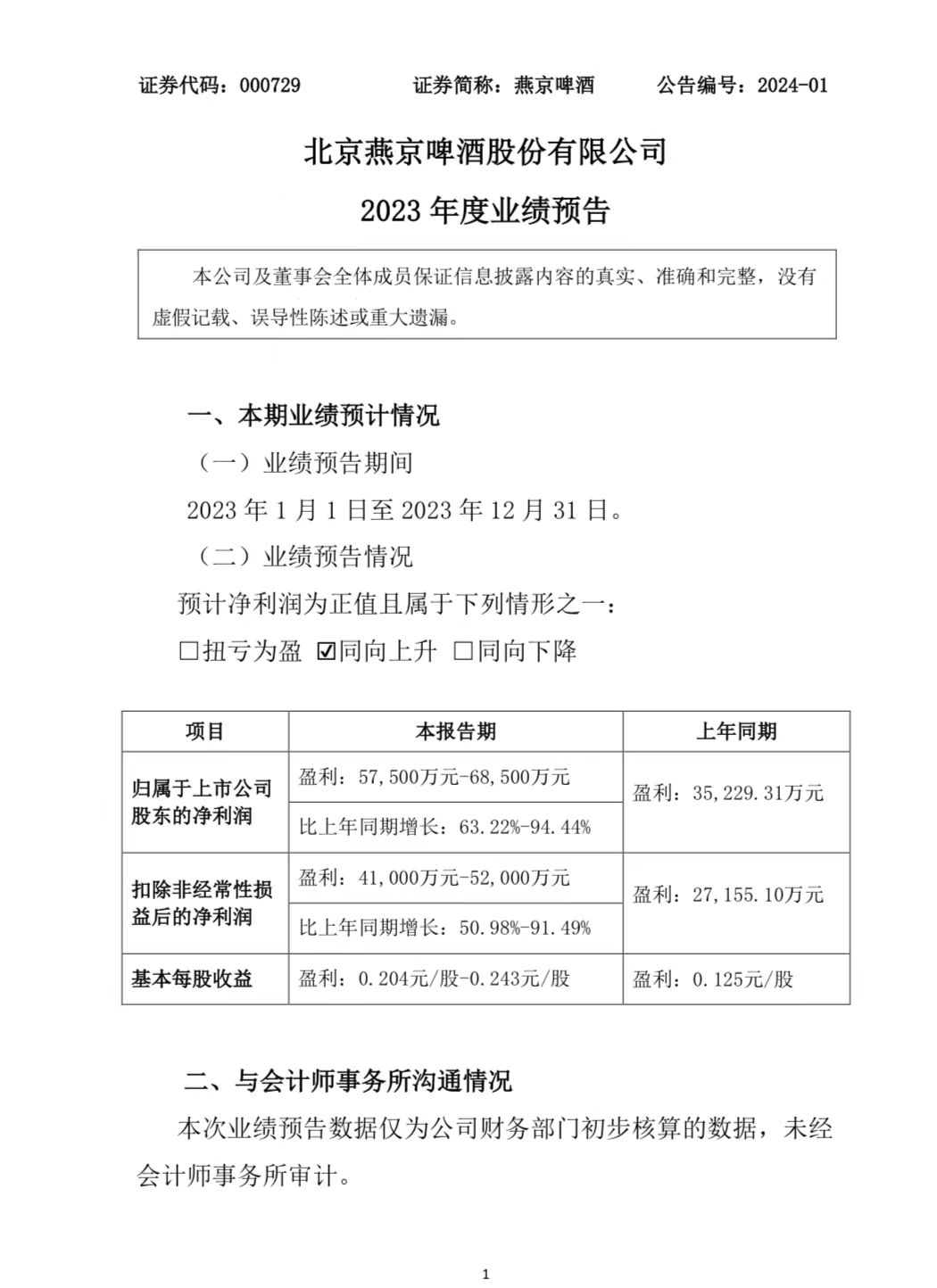1月2日,北京燕京啤酒股份有限公司(简称“燕京啤酒”)发布2023年度业绩预告显示,预计净利润增长超六成。