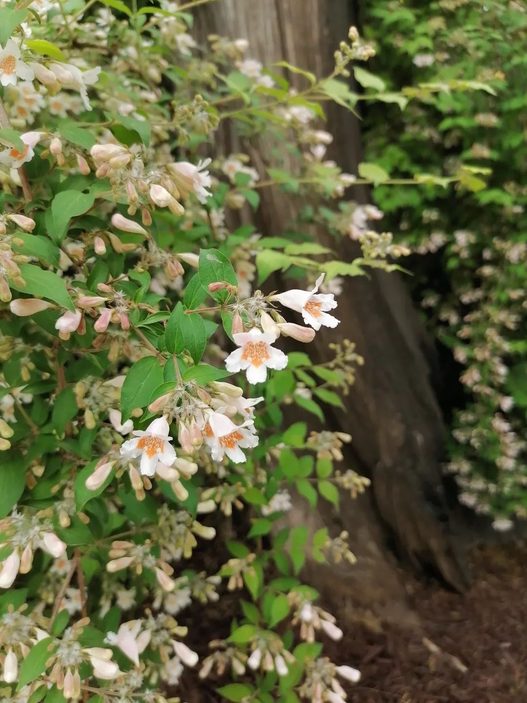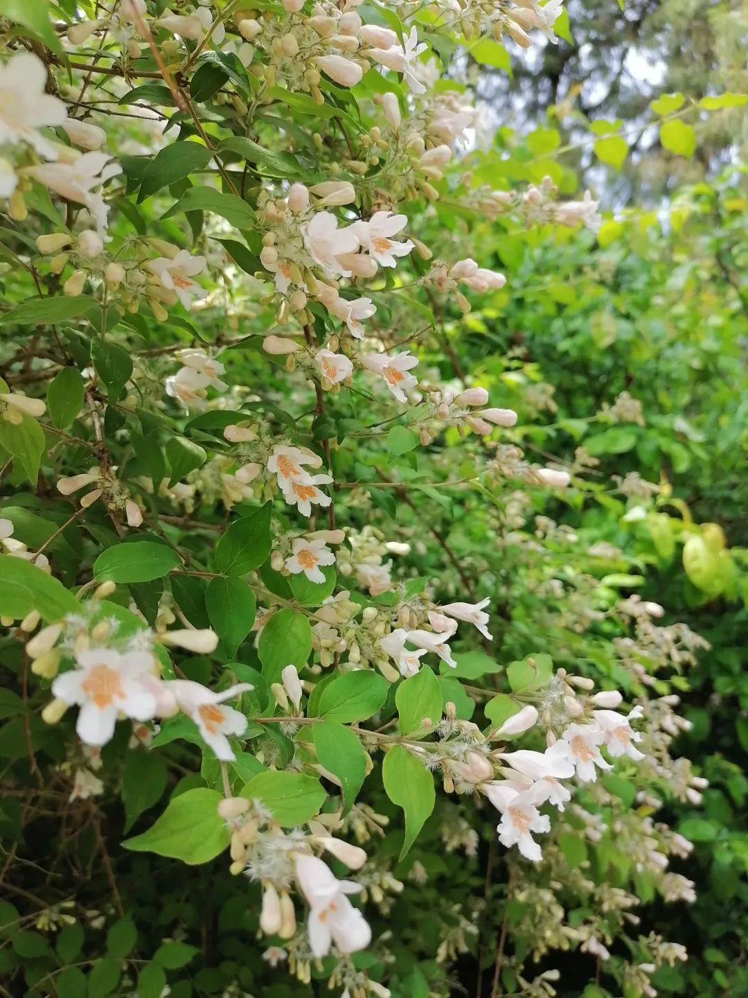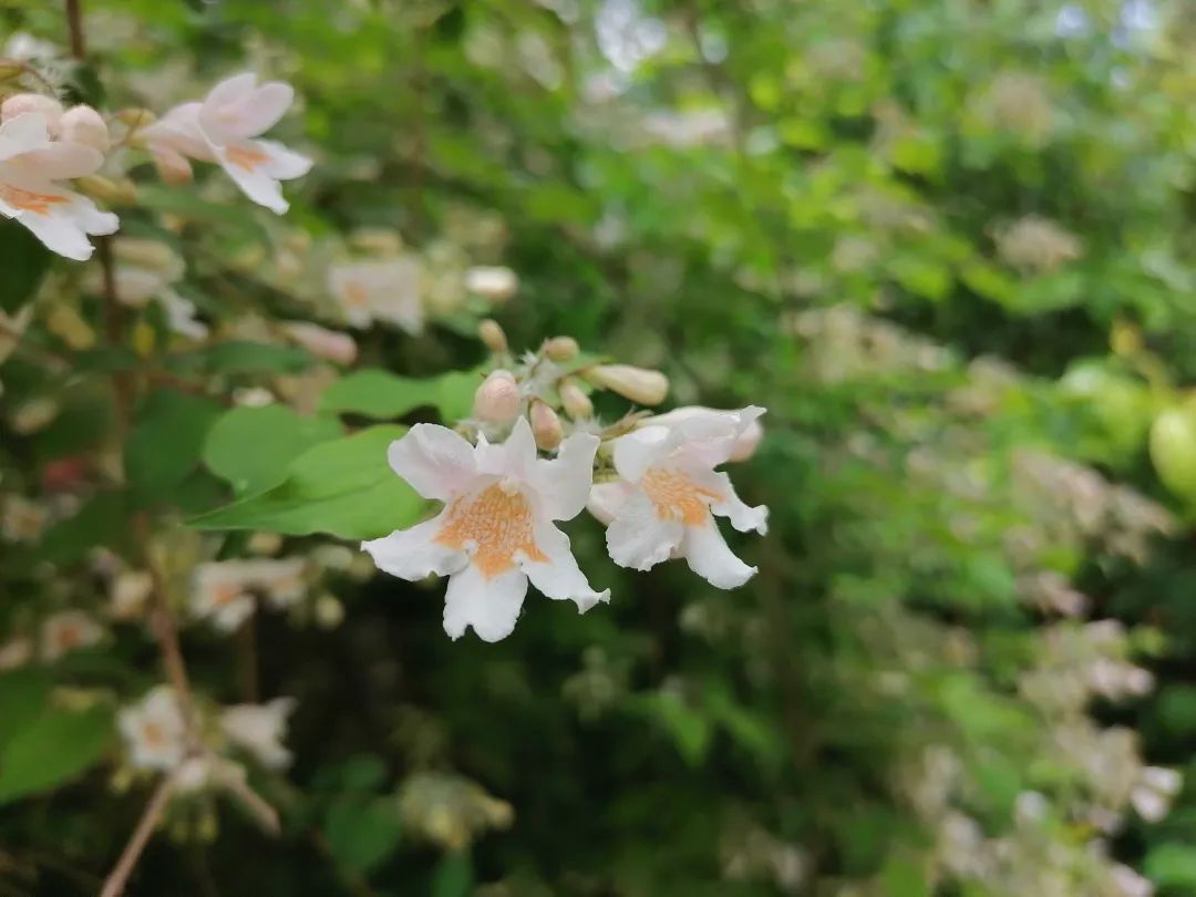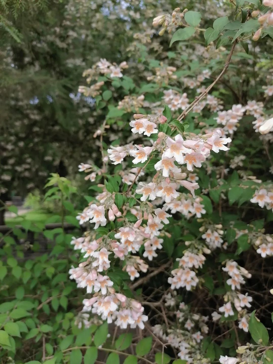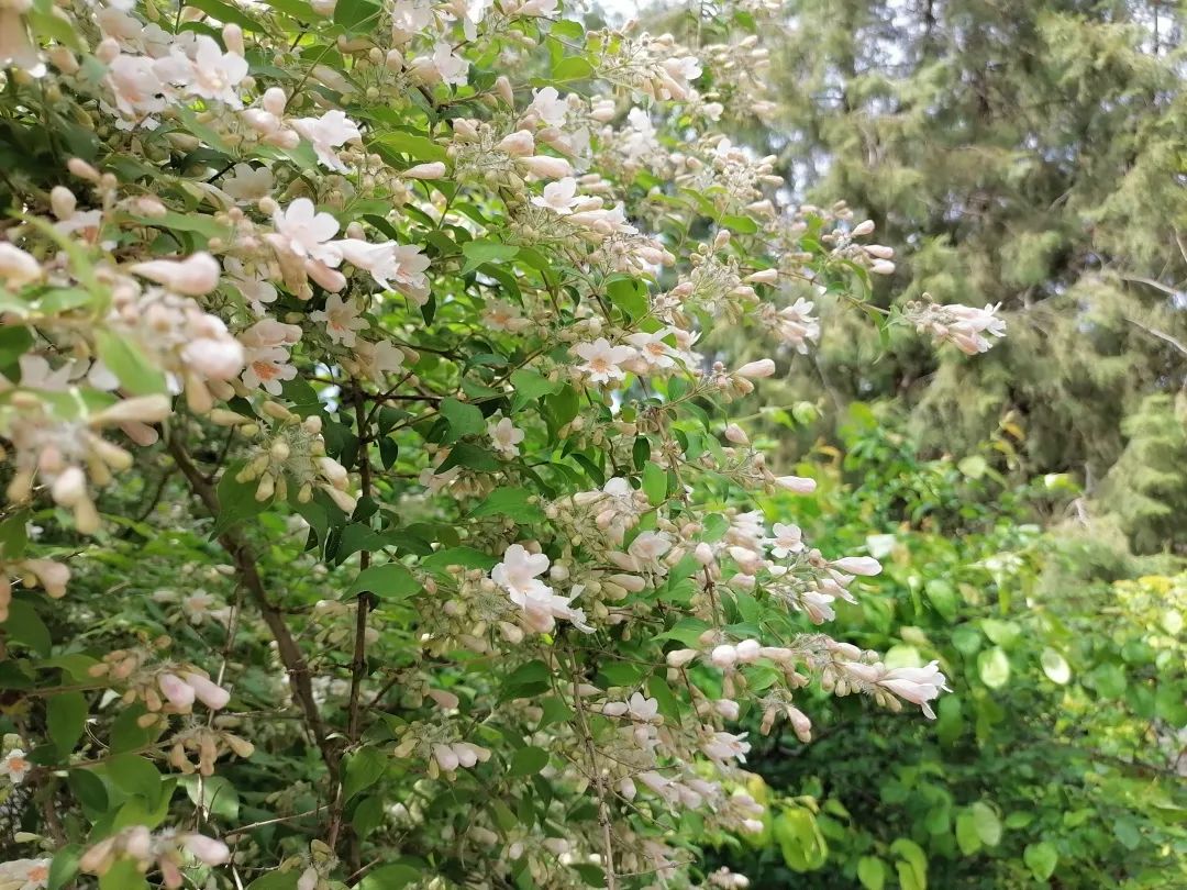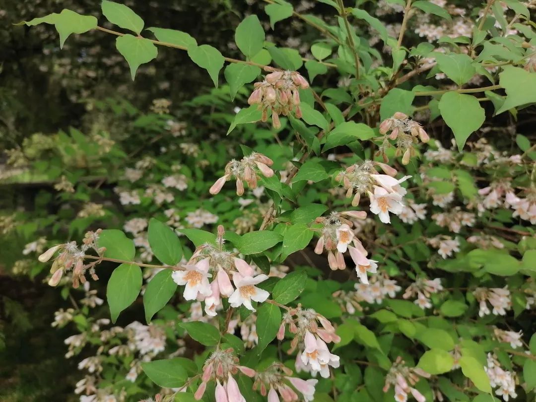 相信见过猬实盛花期的人们都会对它独特的美丽记忆深刻,只见一次便过目不忘。它避开了早春的桃红柳绿、落英缤纷,于百花争艳之后的初夏悄然绽放。仿佛一夜盛开的满树繁花,好似被镀了一层浅绛色的光,一簇簇密集的小花缀满枝条,把叶子都遮挡了下去,远远望去就像是一片暖色的花瀑。近观,猬实的每朵花花冠呈淡粉色,花筒内如同绘画上一般的黄色网纹图案是它独有的魅力。清风拂过,像一尾尾湘妃色的迷你罗裙随风轻曳。