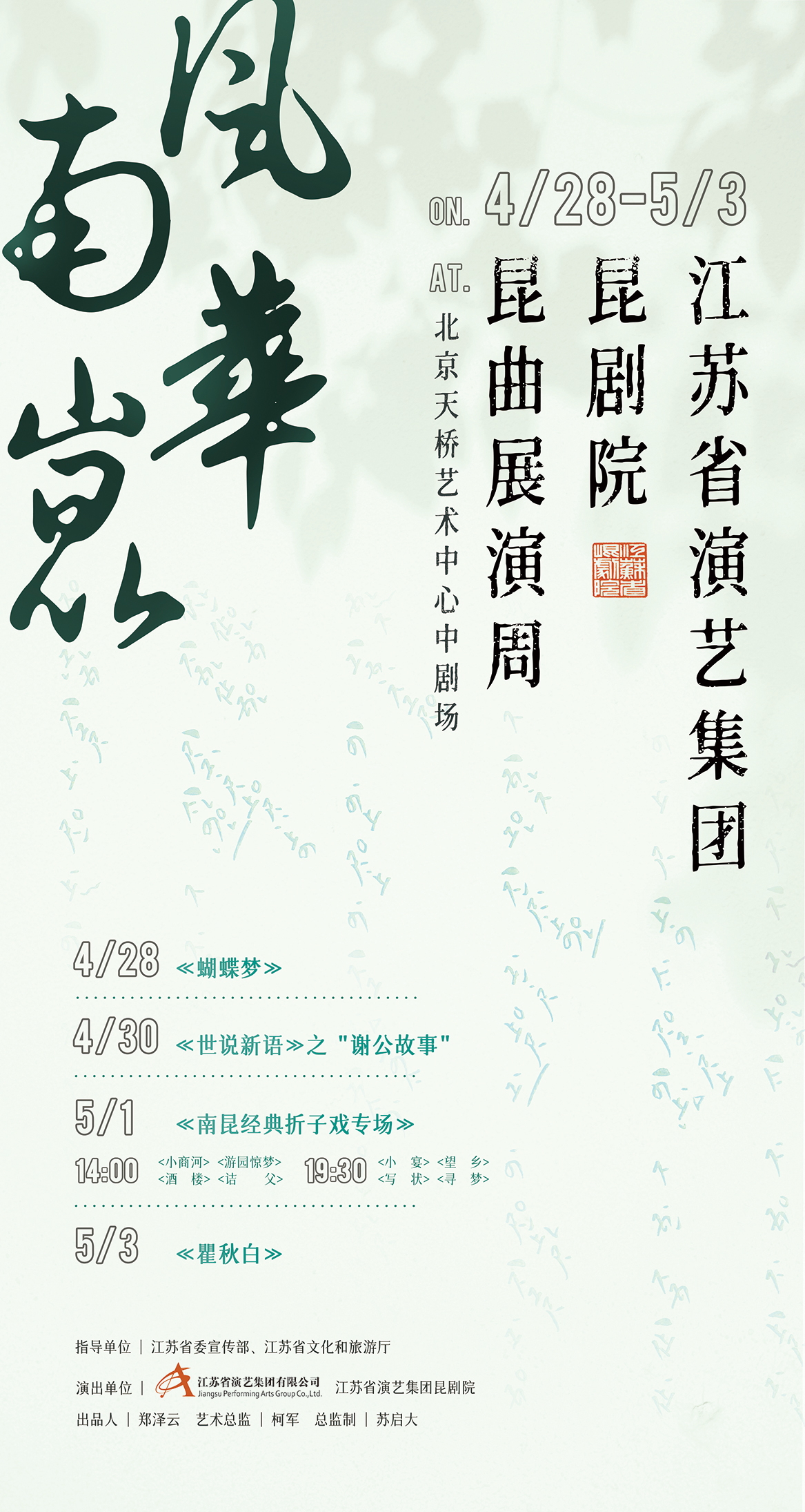 4月28日至5月3日,“南昆风华”——江苏省演艺集团昆剧院昆曲展演周将在北京天桥艺术中心举行,带来整理改编昆剧《蝴蝶梦》、新编历史剧《世说新语》之“谢公故事”、原创革命题材昆剧《瞿秋白》三台大戏和两台南昆经典折子戏专场演出。