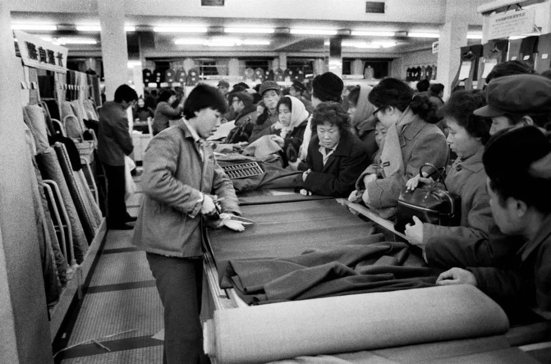 1982年,北京百货大楼里,人们在挑选布匹做衣服。二十世纪八十年代,买布料自制服装仍是主流。