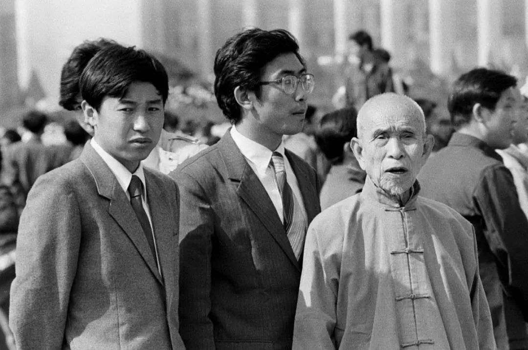 1986年,北京,一位老人和他穿西服的孙子。二十世纪八十年代,全国掀起“西装潮”, 中山装、军便装逐渐退出时装舞台。