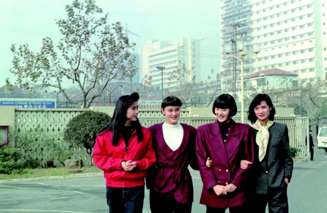 1991年,上海,穿着时尚服装的女性。二十世纪九十年代初期,中国的服装市场开始猛追世界潮流,时逢西方女装流行宽肩,于是中国都市女性的大衣、套装、毛衣,甚至衬衫、连衣裙都添加了海绵垫肩。
