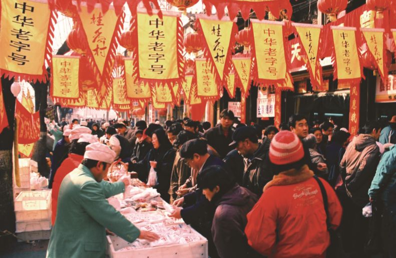 1998年,北京,庙会上的老字号。 人们生活富裕了,菜肴的种类丰富了,但是在传统的节日里,人们仍然会选择品尝传统食物。