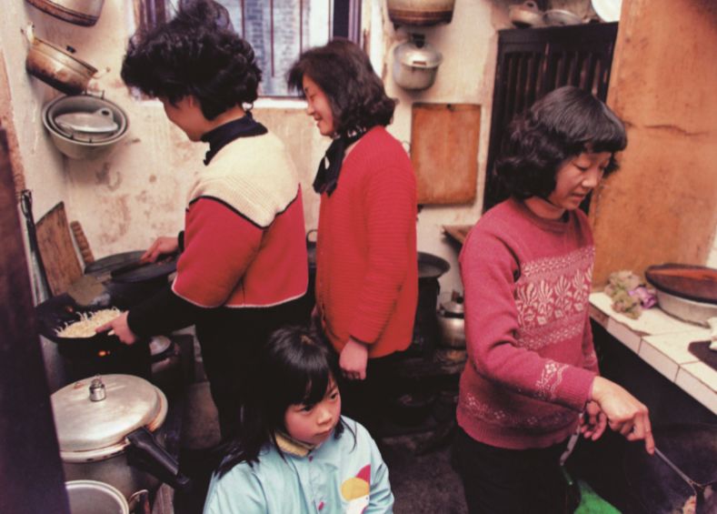 1980年,上海,卢湾区顺昌街道老式石库门房子里,三户居民合用一间不足七 平方米的厨房。