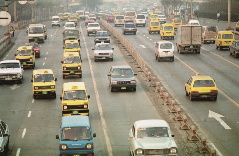 1993年,北京,长长的“面的”队伍是街头一景。这些黄色 “面的”价格便宜、耗油少,主要是天津生产的大发微型面包车。