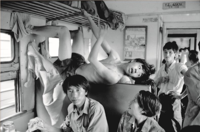 1995年,从武汉开往长沙的列车 上,一位男子在拥挤的车厢中,躺在了硬座座椅靠背上。二十世纪九十年代, 全国的火车大多数还是 “绿皮车”,由于车次较少, 火车内常常是异常拥挤。