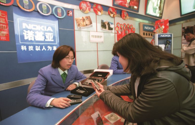 2000年,上海,诺基亚专卖店员工在仔细为购买手机的顾客介绍产品性能。2000 年前后,诺基亚、摩托 罗拉、爱立信等国外手机品牌进入中国市场, 标志着手机的使用开始普及。